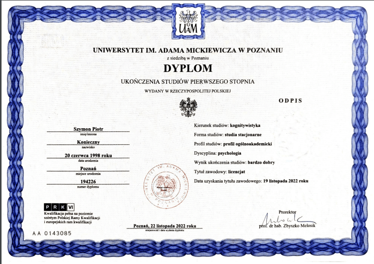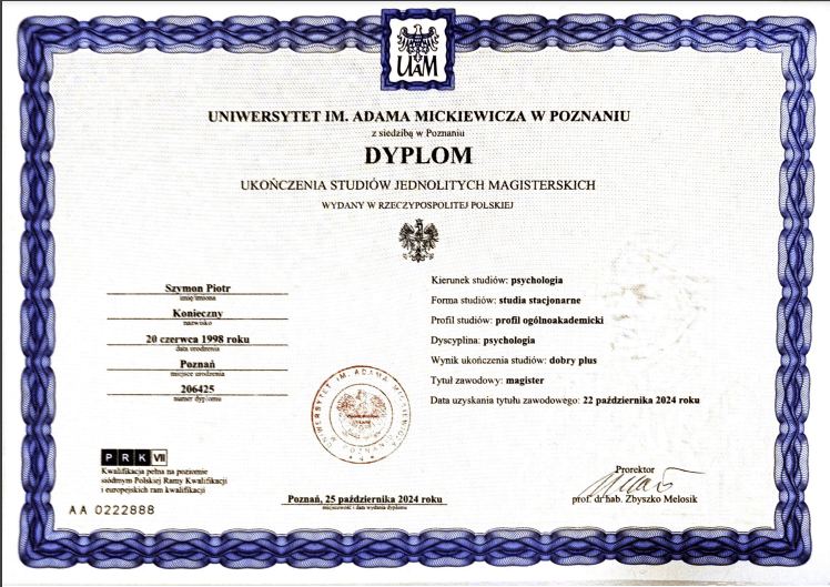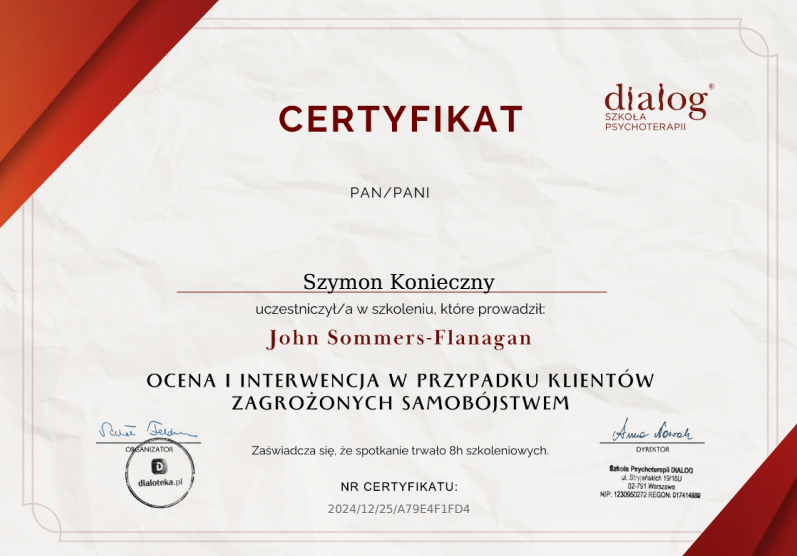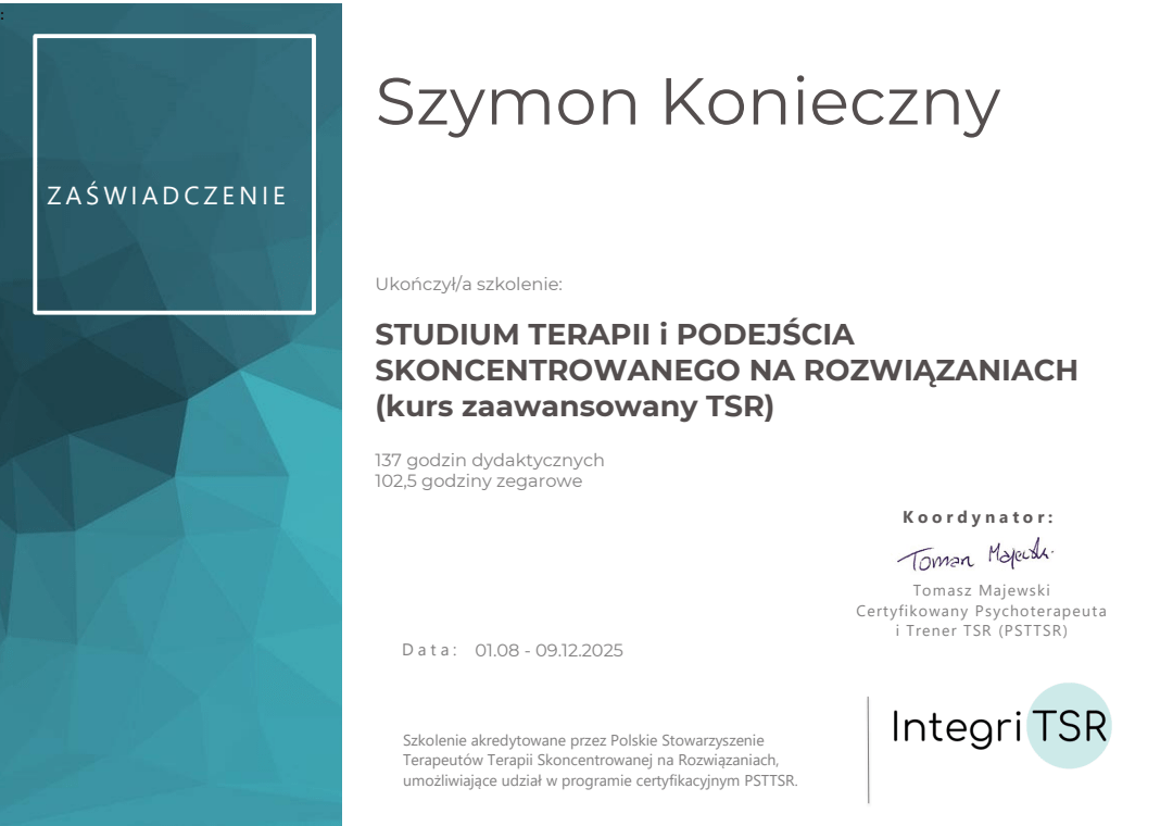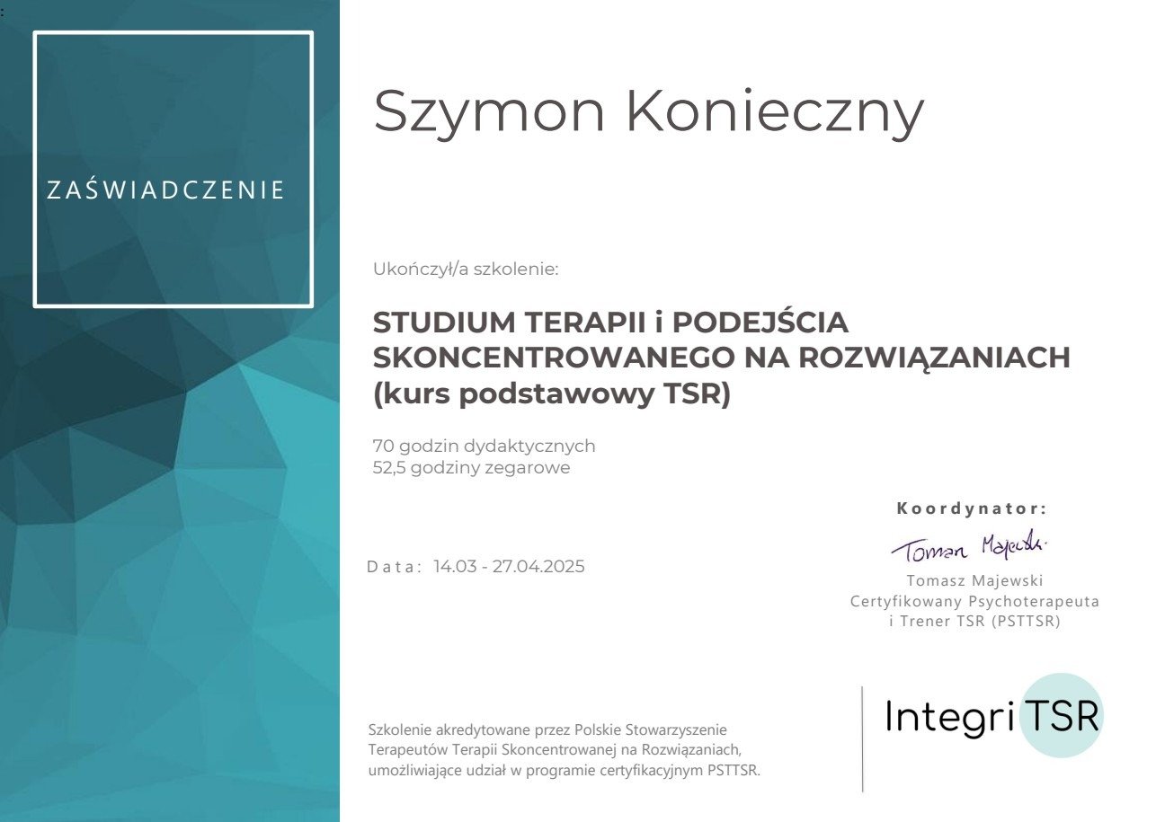 Nazywam się Szymon Konieczny. Jestem psychologiem i kognitywistą, a także terapeutą TSR (Terapii Skoncentrowanej na Rozwiązaniach) w trakcie szkolenia. Pracuję z osobami dorosłymi, prowadząc konsultacje psychologiczne i terapię online.